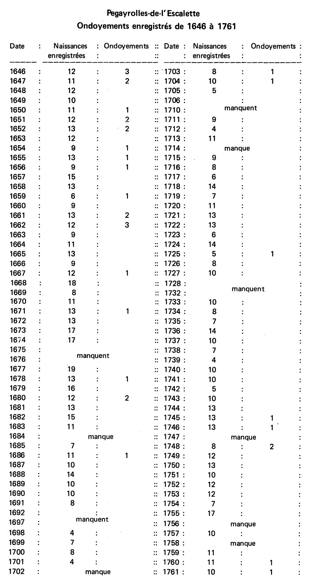 D’autre part, le clergé omet de relever les ondoyements faits à la maison pendant d’assez longues périodes : de 1705 à 1724 par exemple à Pegayrolles la proportion des enfants ondoyés, c’est-à-dire en péril à la naissance, ne peut guère être sérieusement évaluée. Pendant la décennie 1653-1662, il semble que soit régulièrement notée la cérémonie de l’eau faite à l’accouchement lorsque l’enfant est en danger de mort. Il y aurait eu 9 enfants ondoyés en 10 ans sur 111 naissances, soit 1 sur 12. Ces enfants ont une très faible chance de vie dans le premier mois, les jumeaux surtout. Or on les retrouve très rarement au registre des sépultures. Étudier les ondoyements revient à faire une étude de cas.