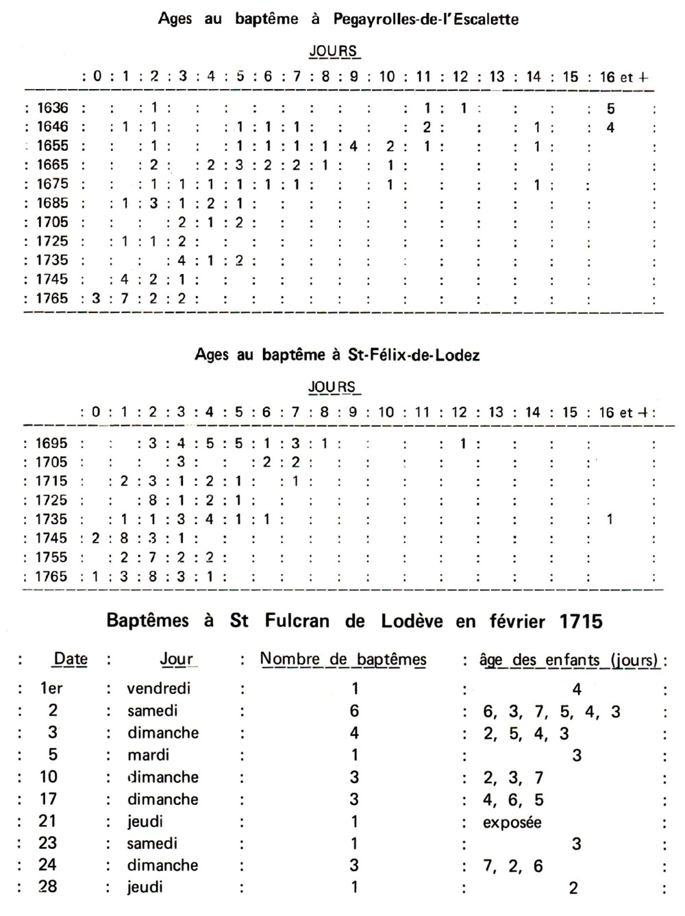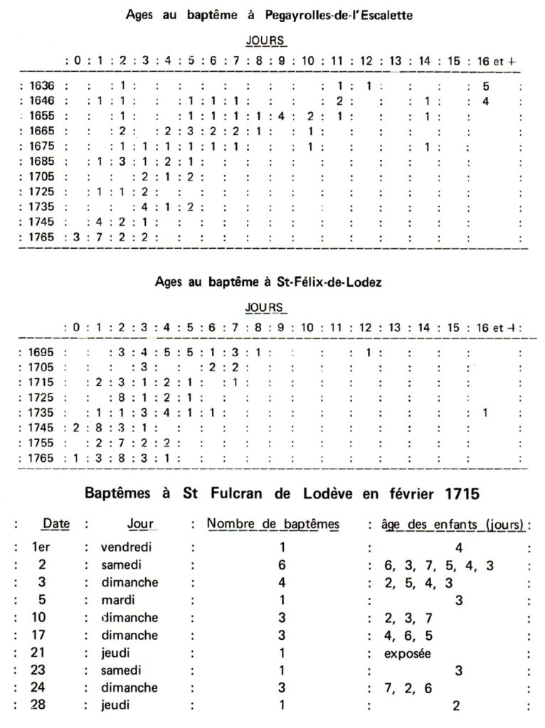 Âges au baptême relevés dans la paroisse St Fulcran de Lodève (sondages discontinus au XVIIe siècle où des registres manquent, sondages de 10 ans en Mans au XVIIIe siècle).