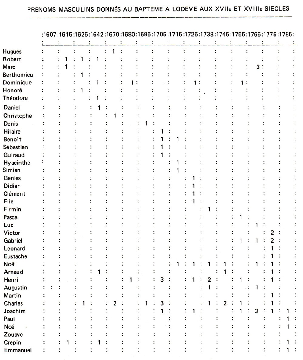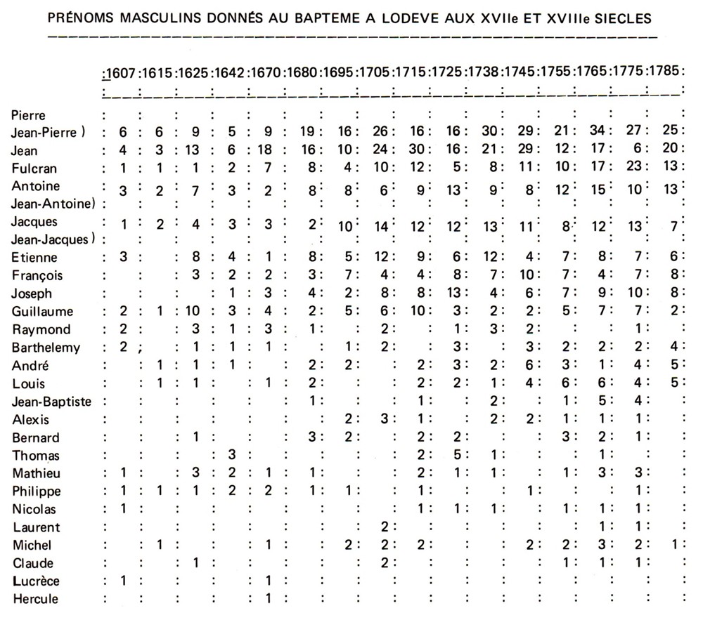 On pourrait envisager une étude approfondie de la vie des prénoms donnés pendant deux siècles à St Fulcran de Lodève. En voici une ébauche, constituée par les comptages de ces prénoms par sondage de 10 ans en 10 ans lorsque cela est possible, et à intervalle différent lorsque manquent les registres.
