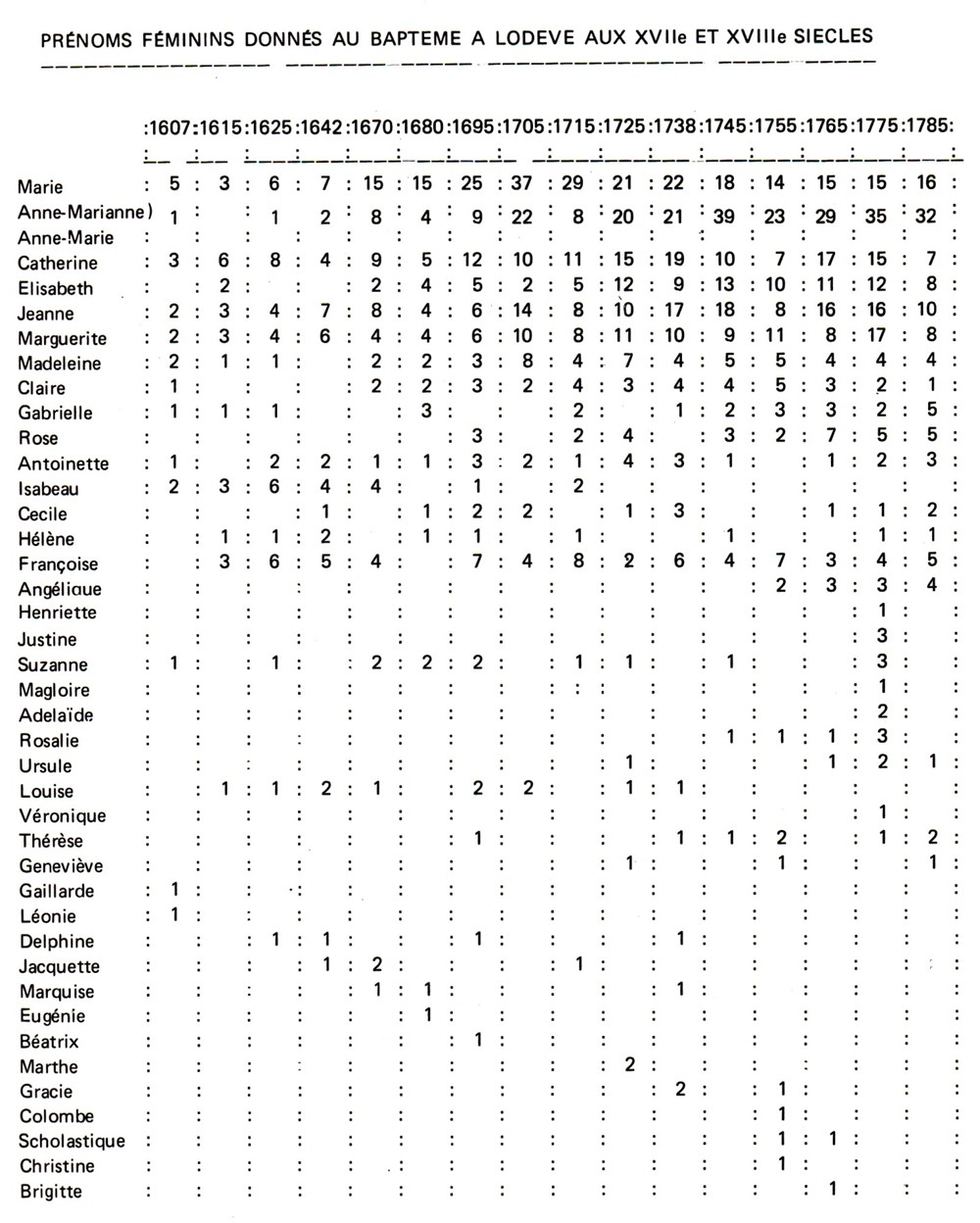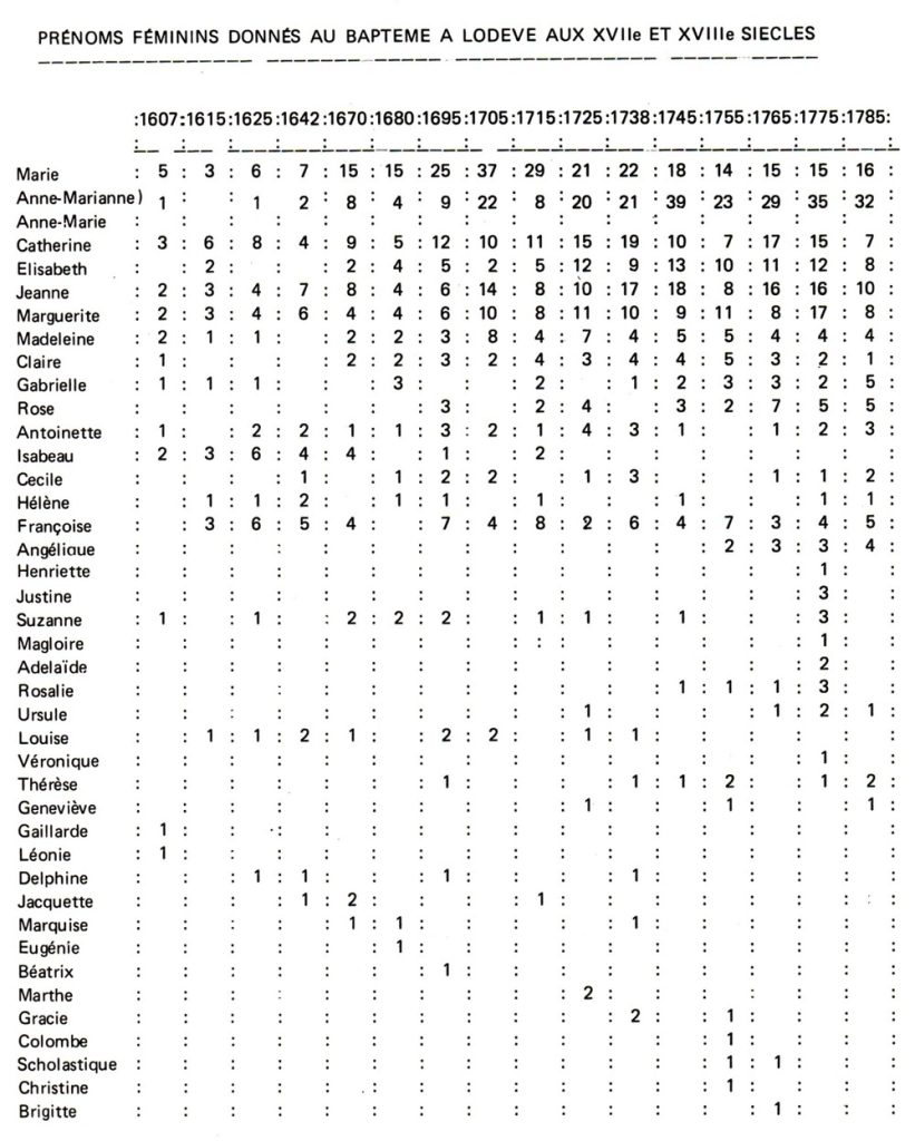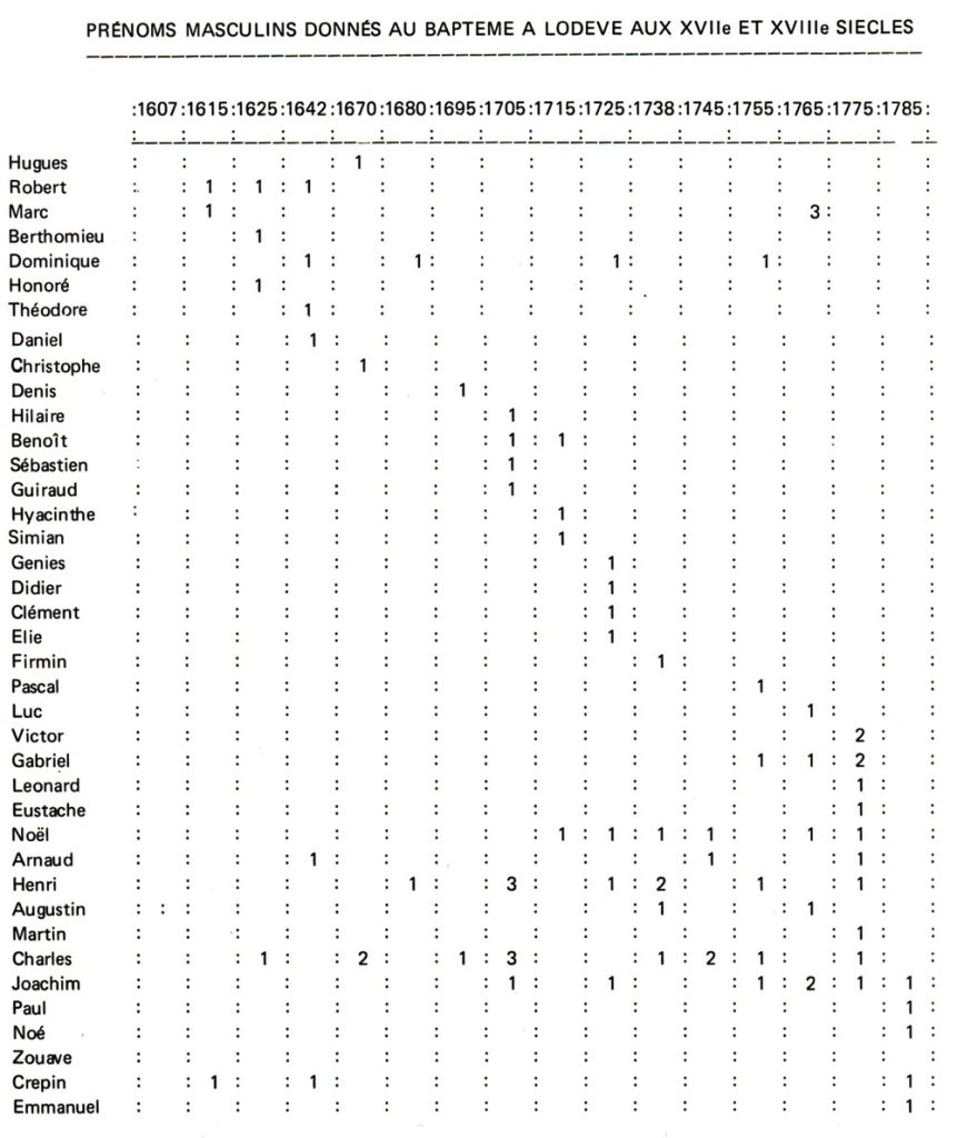 Le répertoire des prénoms donnés n’excède pas 65 pour les garçons, 40 pour les filles. Pour une année donnée, les parents choisissent entre 20 à 25 prénoms masculins, 10 à 15 prénoms féminins. C’est assez peu. Le conformisme des habitudes familiales est considérable. La recherche d’originalité existe (des prénoms donnés une fois et que l’on ne retrouve pas). On la trouve plus fréquemment chez les garçons. Très rarement, les prêtres admettent – par erreur vraisemblablement – un prénom qui n’appartient pas au calendrier chrétien Noé, Zouave, Marquise. Certaines années – 1775 – l’ensemble des prénoms donnés échappe légèrement plus aux conventions. Enfin ceux qui relèvent des dévotions les plus enracinées restent continuellement populaires : Pierre, Jean, Marie. Certains apparaissent progressivement, liés au culte d’un saint : Fulcran, Joseph, Anne, Claire, Élisabeth. (Isabeau disparaît vers 1725). La transmission des prénoms de père en fils, de mère en fille ou de parrain et marraine en filleul, est continue, et l’éventail ne s’en élargit que très peu au XVIIIe siècle.