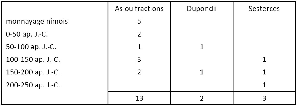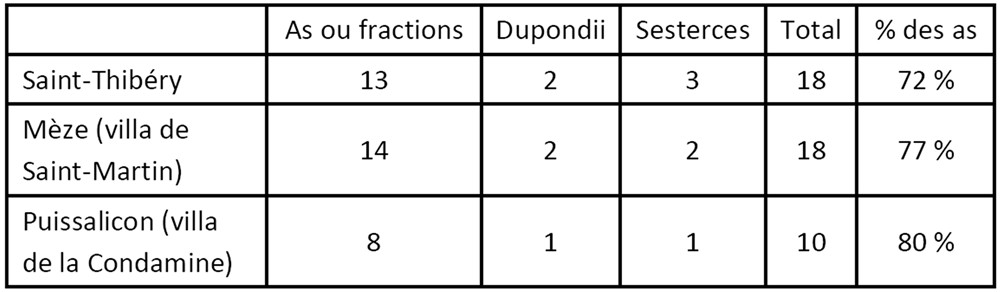 Première évaluation, globale, les petites espèces de bronze (as) l’emportent nettement, dans cette récolte, comme sur des sites voisins appartenant à la cité romaine de Béziers, comme l’indique le tableau suivant 5 :