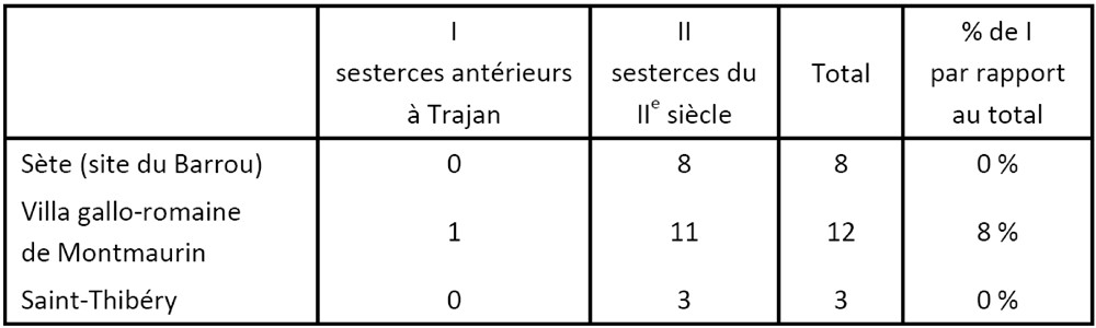 6 Références bibliographiques : Sète (Le Barrou) : C. Brenot, M, Christol, A. Freises, Bull. Soc. Fr. Num., 1974 p. 586-590 Montmaurin : M. Labrousse, dans G. Fouet, op. cit., Paris, 1969, p. 334-381. On peut aussi ajouter d’autres références à Mariana, tous les sesterces sont postérieurs à 98 au Liri, 72 % sont dans ce cas à Conimbriga, site portugais (I. Pereira, J.-P. Bost, J. Hiernard, Fouilles de Conimbriga, III – Les monnaies, Conimbriga – Paris, 1974), 83 % sont dans ce cas.