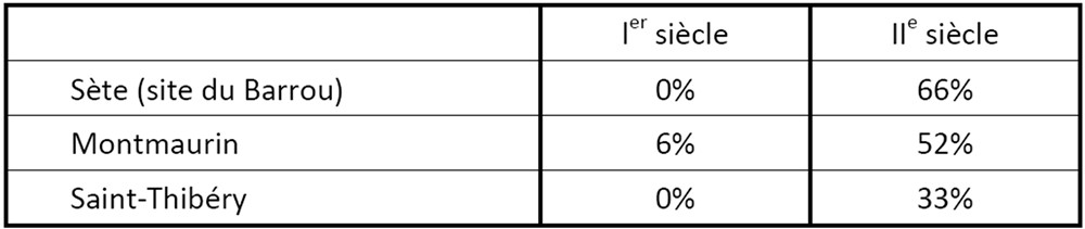 Mais, à considérer de plus près ces données, à Saint-Thibéry, comme dans d’autres sites, deux périodes apparaissent nettement, comme le montrent les tableaux suivants 6 :