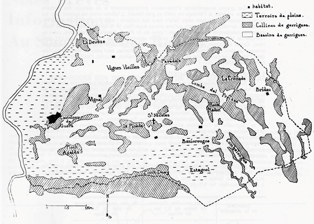 Sur 9 000 sétérées, équivalent approximatif des 2 240 ha 9, seules 5 205 (5 015 exactement, si l’on tient compte des rectifications ultérieures du tracé des limites communales) apparaissent dans le compoix comme terres allivrées : 43 % du sol échappe donc à l’allivrement. On pourrait croire que les paysans sont à l’aise, que ce terroir cultivé n’est pas aux limites de ses possibilités, et qu’il existe des réserves exploitables. Détrompons-nous, les terres non-allivrées sont uniquement des garrigues. Si l’on compare le terroir cultivé en 1690 (5 015 sétérées) et ce qu’il est au début du XIXe siècle quand la première vague viticole a poussé à l’extension des cultures en même temps que la pression démographique (5 330 sétérées), il faut bien admettre que dès la fin du XVIIe siècle les paysans sont quasiment parvenus aux limites du cultivable et du rentable. Au delà de l’espace cultivé il ne demeure plus que des marges, aux possibilités réduites et aléatoires.