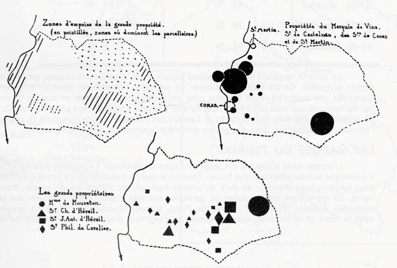 En somme apparait ainsi un second espace rural, distinct des chasses gardées de la grande propriété. Certes celle-ci y dispose de parcelles (70 sétérées pour le Seigneur de Castelnau, par exemple), mais l’espace rural est pulvérisé à l’extrême, et surtout diversifié par les cultures qui sont pratiquées. Les forains n’y sont pratiquement pas présents, hormis les citadins de Pézenas qui montent à l’assaut des coteaux voisins d’au delà de la plaine de l’Hérault, en sautant par dessus la grande propriété inaccessible au démembrement.
