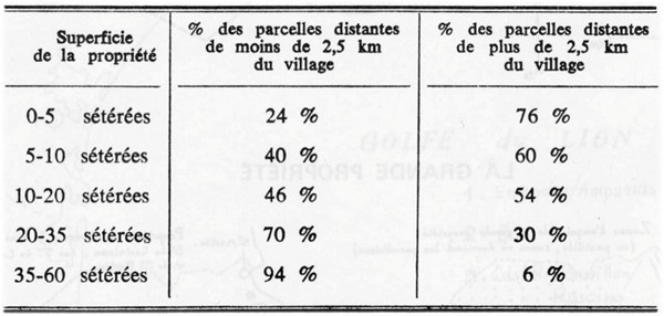 Autre trait caractéristique de la répartition des propriétés dans l’espace rural, les moyens propriétaires sont ceux dont les parcelles sont, pour l’ensemble, regroupées dans le proche horizon (jusqu’à 2,5 kms du village). C’est à l’intérieur de cette limite que le Sr J. Joulian possède les 4/5 de ses terres, ce qui le différencie des autres gros possédants.