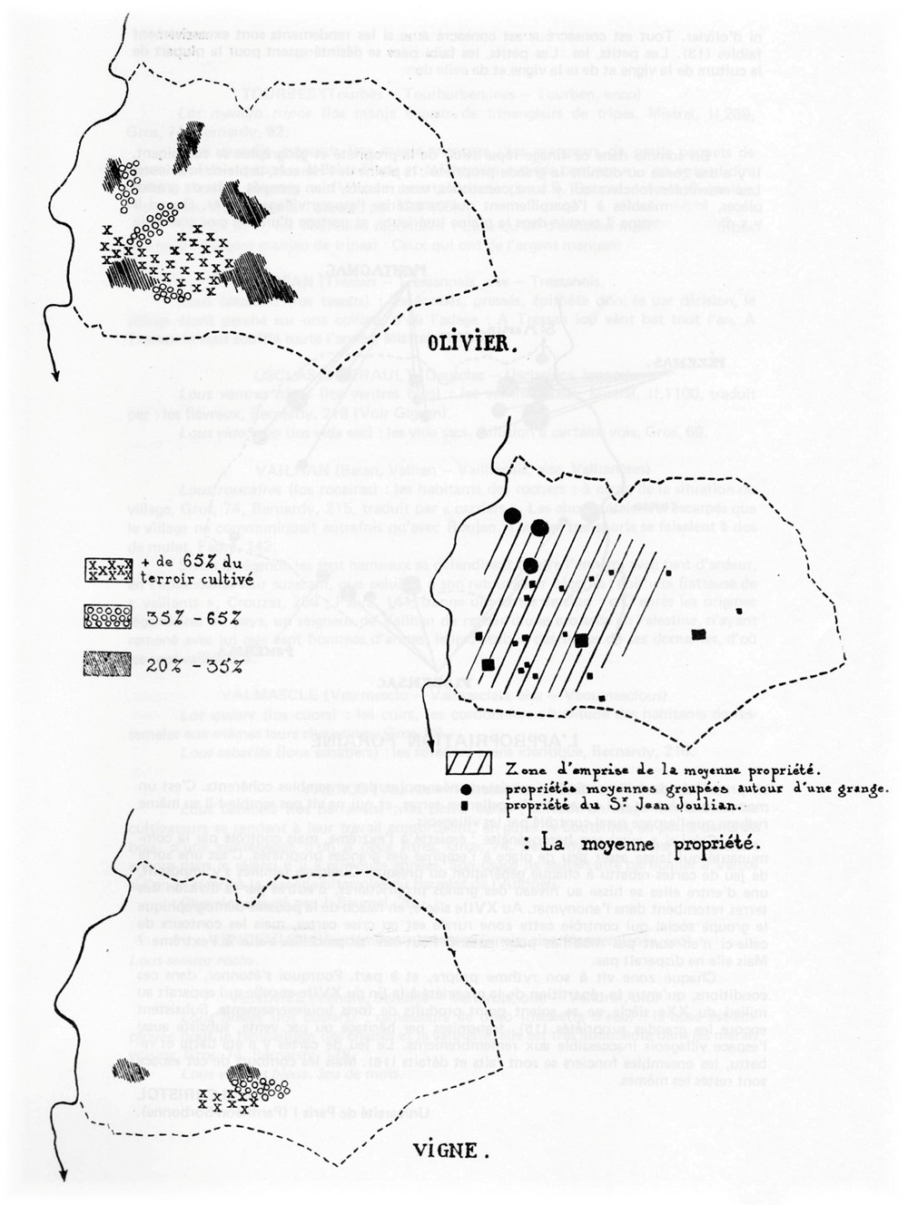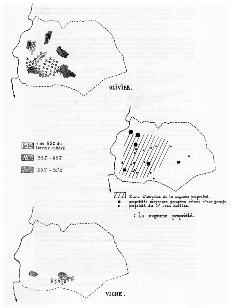 Si la grande propriété a des chasses gardées, la communauté a aussi une zone d’emprise bien délimitée. On peut la définir à l’aide de l’analyse des structures foncières de la moyenne propriété. Celle-ci, dans la hiérarchie des taillables s’insère entre les limites de 20 et 100 sétérées, c’est-à-dire 1/10e de la population taillable. C’est à partir du seuil d’appropriation de 20 sétérées qu’apparaît une réelle diversification des cultures. En dessous, ce qui prime c’est la recherche des subsistances, et la part consacrée à la vigne et à l’olivier, chez les petits propriétaires, est infime. En revanche, au-dessus de 20 sétérées, on se rapproche de l’équilibre entre les trois cultures méditerranéennes fondamentales (41 % de la superficie sont, pour ce groupe, consacrés à la vigne et à l’olivier). Encore faut-il nuancer : pour ceux qui ne détiennent qu’un peu plus de 20 sétérées le souci des subsistances est encore réel, mais pour ceux qui détiennent plus de 40 sétérées (huit personnes) et qui sont à l’abri de tels soucis, les cultures se répartissent moitié-moitié en ce qui concerne les céréales d’une part, la vigne et l’olivier d’autre part 12.