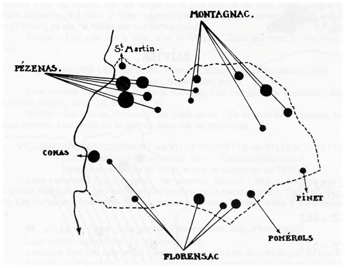 7 kms de profondeur, 4 à 5 de largeur, telles sont les dimensions des grands axes de ce terroir. Quant à l’habitat principal, celui de la communauté des habitants, il s’est implanté au sommet du coteau dominant la plaine de l’Hérault, dans une position nettement excentrée : il en résulte que certains tènements sont bien plus proches de villages voisins que de l’habitat de la communauté.